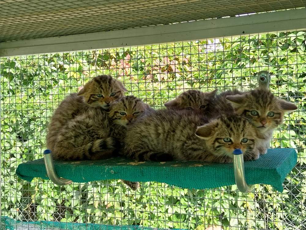 Âgés d’à peine deux mois environ, ils ont été nourris à leur arrivée avec du lait spécifique. De la nourriture carnée a ensuite été proposée. Notre enclos est spécifiquement aménagé pour l’accueil de ce type d’animaux. Nous avons des griffoirs, des litières, des plateaux à différentes hauteurs, des cachettes… Un système de vidéosurveillance complète l’installation afin d’observer le comportement et l’évolution des animaux sans occasionner le moindre dérangement. Les cinq chats ont grandi et évolué ensemble durant sept mois.